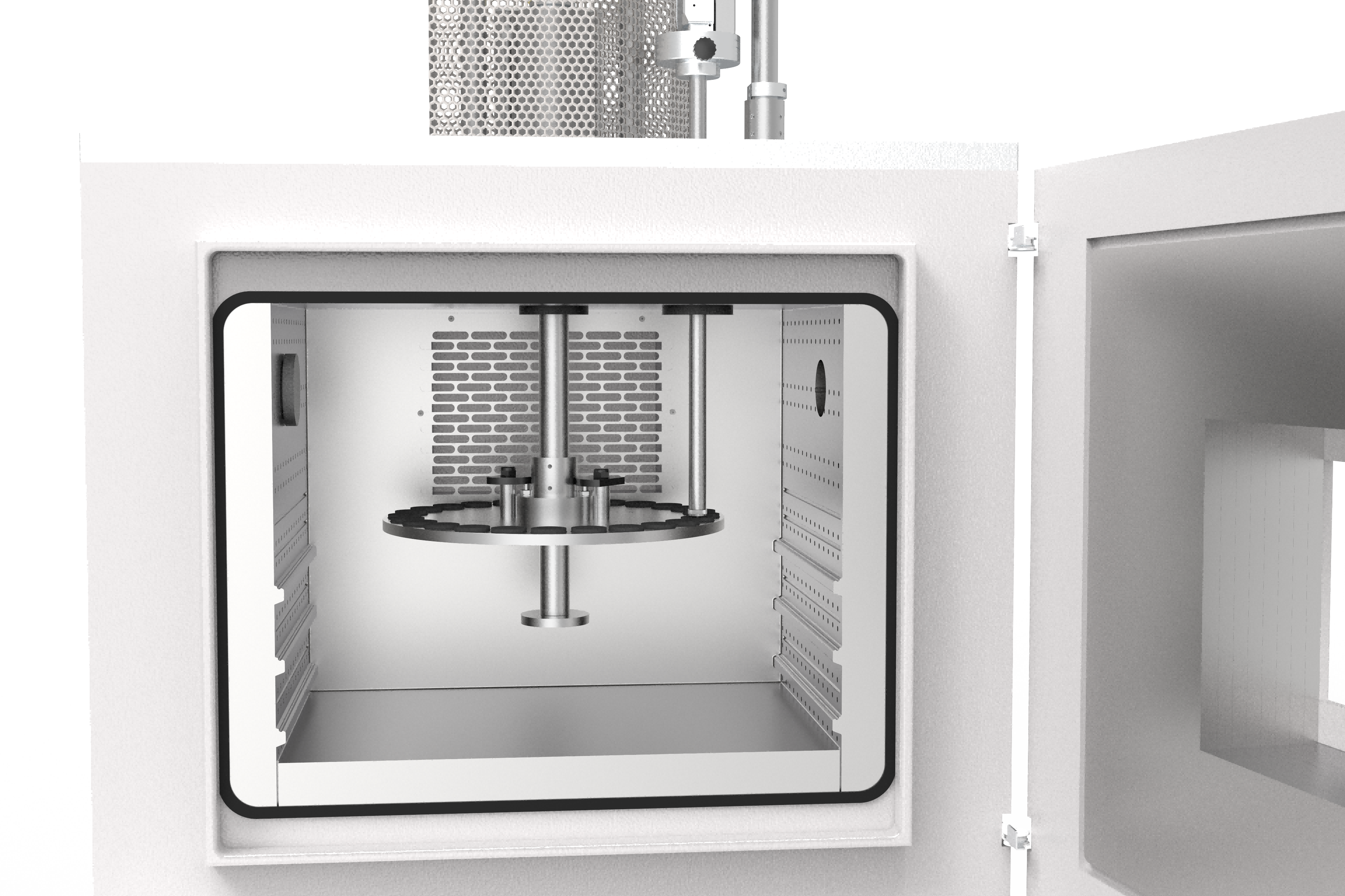 A high air circulation rate in the test area ensures uniform temperature and humidity distribution. Superior temperature distribution is achieved through air convection from the back and sides. The meH CHAMBER is equipped a high-efficiency, three-stage compressor unit with a closed refrigeration system. No external gas or cooling medium is required, enabling continuous operation with minimal running costs.